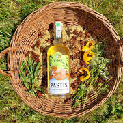 庭の植物を活かしたオーガニックのパスティス:ヒソップ(シソ科またはミント科のハーブ)、ラベンダー、カモミール、アニス、リコリス、そして最後にペリゴール産の蜂蜜が加わります。スパイスとともに有機穀物アルコール中に24時間浸漬させます。